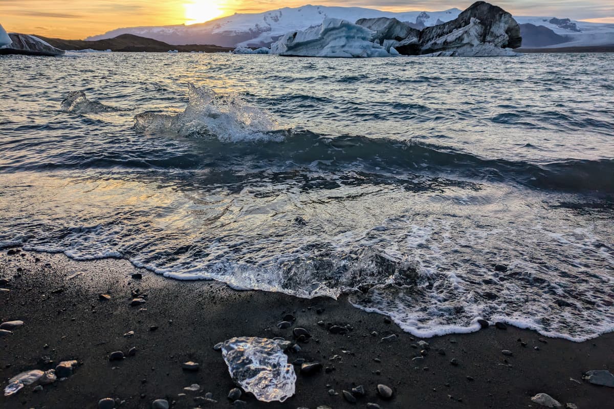 After emerging from the seemingly endless stretch of hardened lava, the road winds through the hills around an even larger icecap, Vatnajokull, that empties into an oceanside bay popularly known as Diamond Beach. Chunks of ice, some the size of basketballs and others the size of school buses, cleaved from the glacier are polished in the bay and litter the black sand beach like jewels. Iceland’s striking beauty brings with it one particularly modern annoyance — people buzzing every conceivable sight with drones in a never-ending quest for social media cachet. A couple of these influencers ignored the No Drones signs at Diamond Beach and were buzzing the small icebergs during our entire visit.