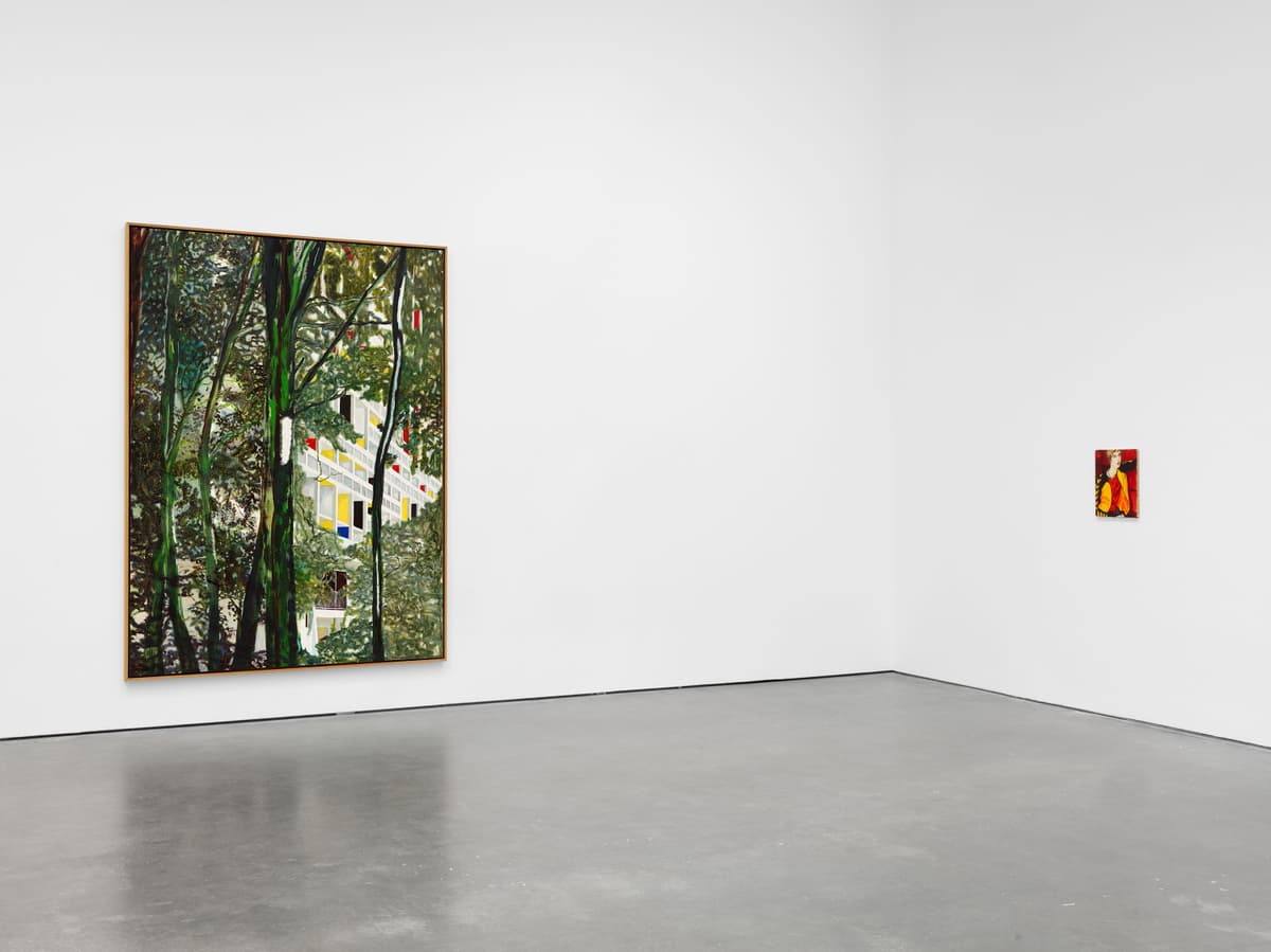 The standout of the show, however, has to be Mr. Doig. His now famous painting of the restored Corbusier apartment seen through a stand of trees, “Briey (Concrete Cabin),” establishes his ability to convey a deep sense of the personal through landscape. Not since Edvard Munch has landscape had such a swirling, dappled, mesmerizing punch. The same atmospheric grip permeates “jetty,” his view of a lone figure on a pier going out to a lakeside that then ascends to dazzling, sun dappled ecstasy.