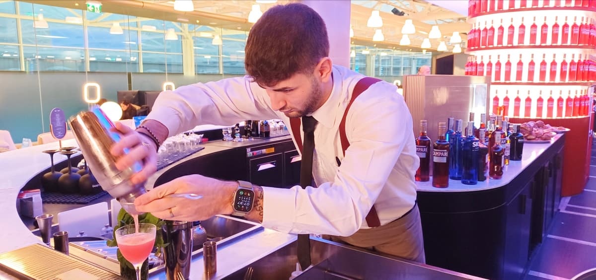 There are things one generally tries to avoid doing at 7:30 in the morning in an airport, but when a snazzy Italian lounge enters the frame must not obeisance be made to an enterprising mixologist’s matinal whims? While I eyed the Hangar’s Espresso Martini I actually tried the Fly Up, a wake-up (sort of) cocktail of Campari and gin blended with lemon and pomegranate juice.