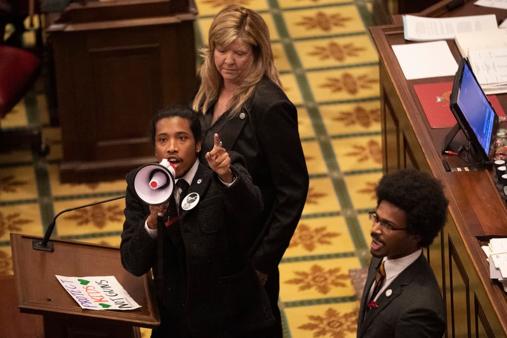 Representatives Gloria Johnson, Justin Jones, and Justin Pearson took to the floor of the Tennessee house of representatives on March 31 as thousands gathered in and around the statehouse. Equipped with a bullhorn, the three legislators interrupted the proceedings to demand stricter gun control measures.