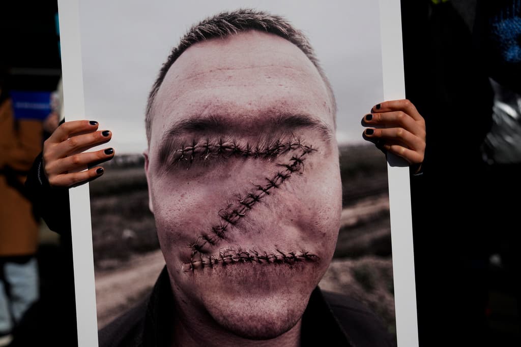 Protesters in Berlin displayed a figure of Mr. Putin bathing in a bath of blood with the Ukrainian flag on the side, alongside shredded ballots in ballot boxes.