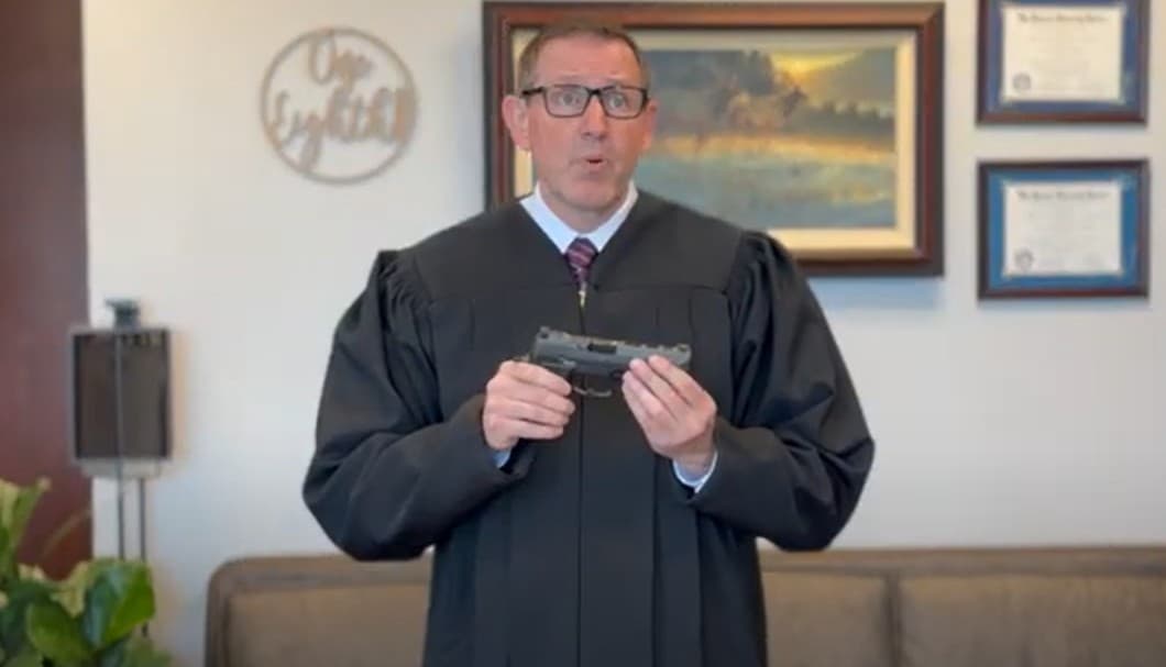 He then transitioned to him handling handguns and loading magazines into them as he explained the parts of the gun. As part of the video, the judge disassembled a handgun and also showed the gun he says he carries for self-defense.