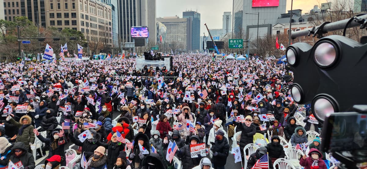 The crowds packing the ten-lane avenue from City Hall to the historic South Gate shouted, in Korean, “Stop the steal” and “no impeachment,” in response to the screamed imprecations and prayers of orators on a huge platform from which megaloud speakers spread their voices across the heart of the South Korean capital.