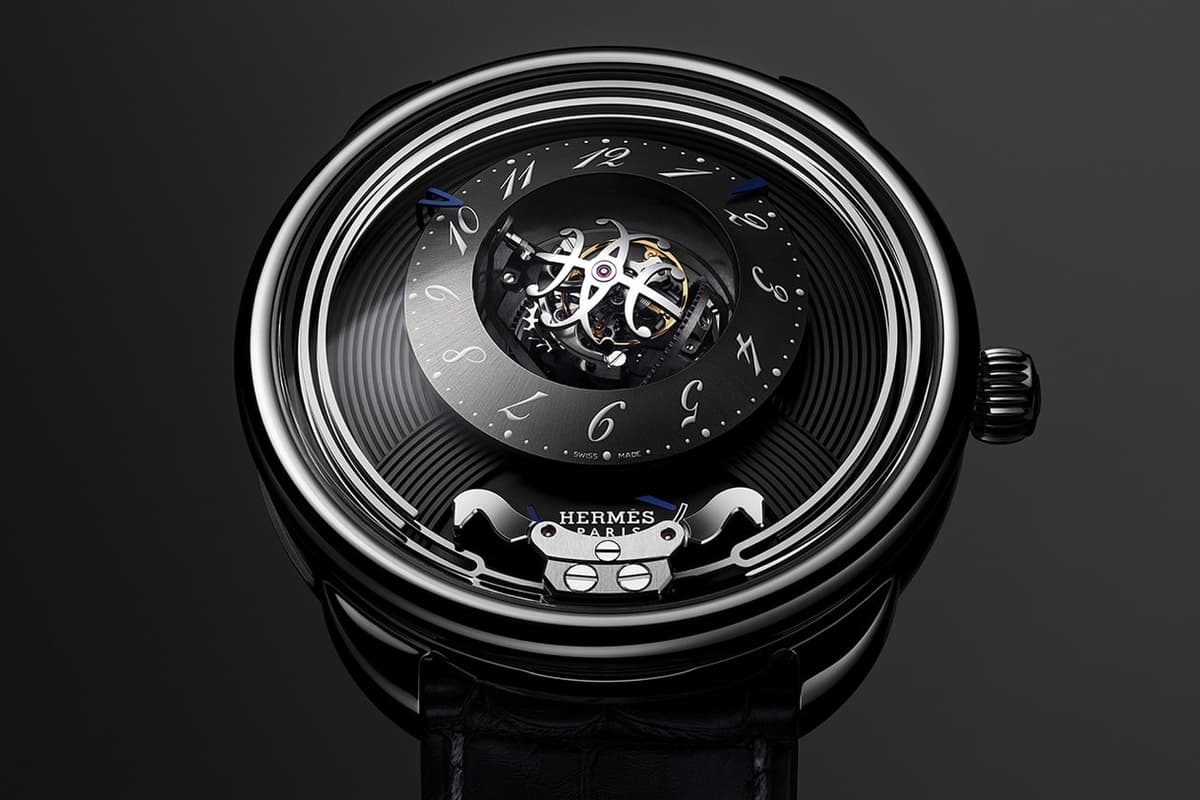 At the heart of the Arceau Duc Attelé—and the center of its semi-skeletonized dial—are two of the most celebrated complications in horology: a three-axis tourbillon and a minute repeater, which chimes the time on request. This is intricate, complex watchmaking, and these features look spectacular in motion; but istead of flaunting them in a completely see-through case, Hermès chose to highlight them in the center, surrounded by a banded dial reminiscent of a Zen garden. The time is displayed with two inverted hands circling a ring subdial, but perhaps the best detail is the minute repeater’s rockers, fashioned in the shape of horses.
