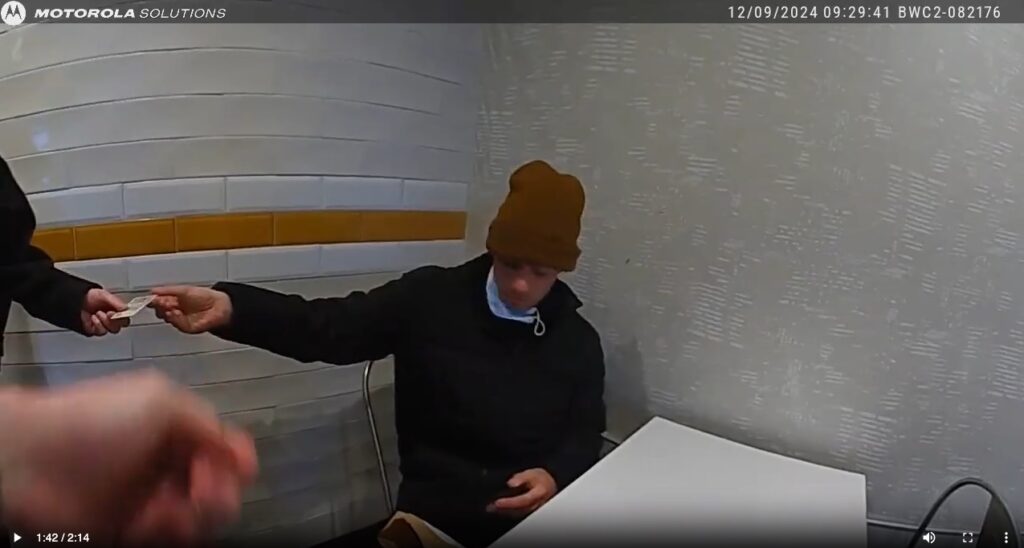 “I asked him, ‘Is this your property?’ He indicated to me it was,” Officer McCoy testified. The court watched bodycam footage, where Officer McCoy is seen moving the backpack from the floor to a table. He said he moved the bag “so that if he (Mr. Mangione) decides he wants to make a dramatic exit, per se, he doesn’t have access to any weapons.”