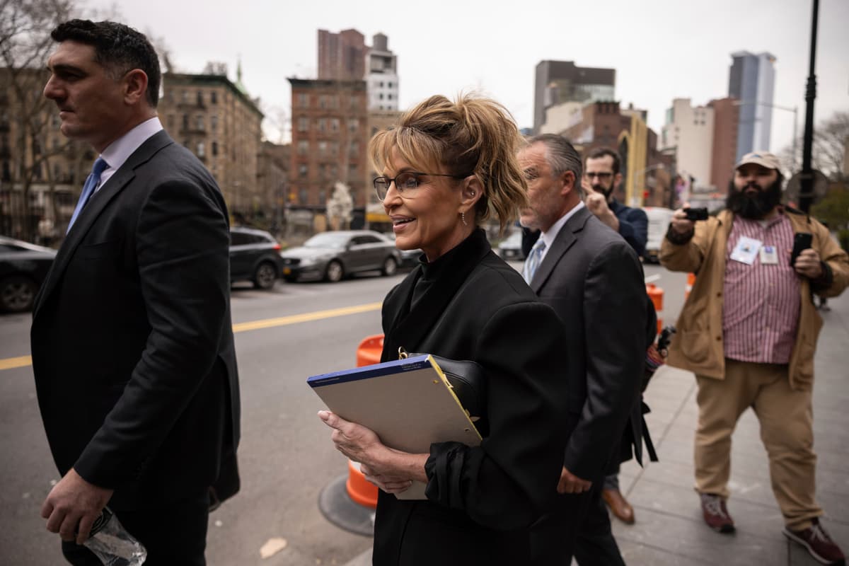 Ms. Palin, the former Alaska governor and GOP vice presidential nominee, was in court on Monday but didn’t answer questions on her way out of the courthouse.