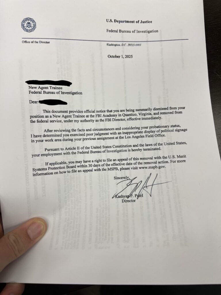 In an October 1 letter, Mr. Patel informed the trainee that he was being summarily dismissed from his role and removed from federal service “under my authority as the FBI Director, effective immediately,” and pursuant to President Trump’s executive powers under Article II of the U.S. Constitution.