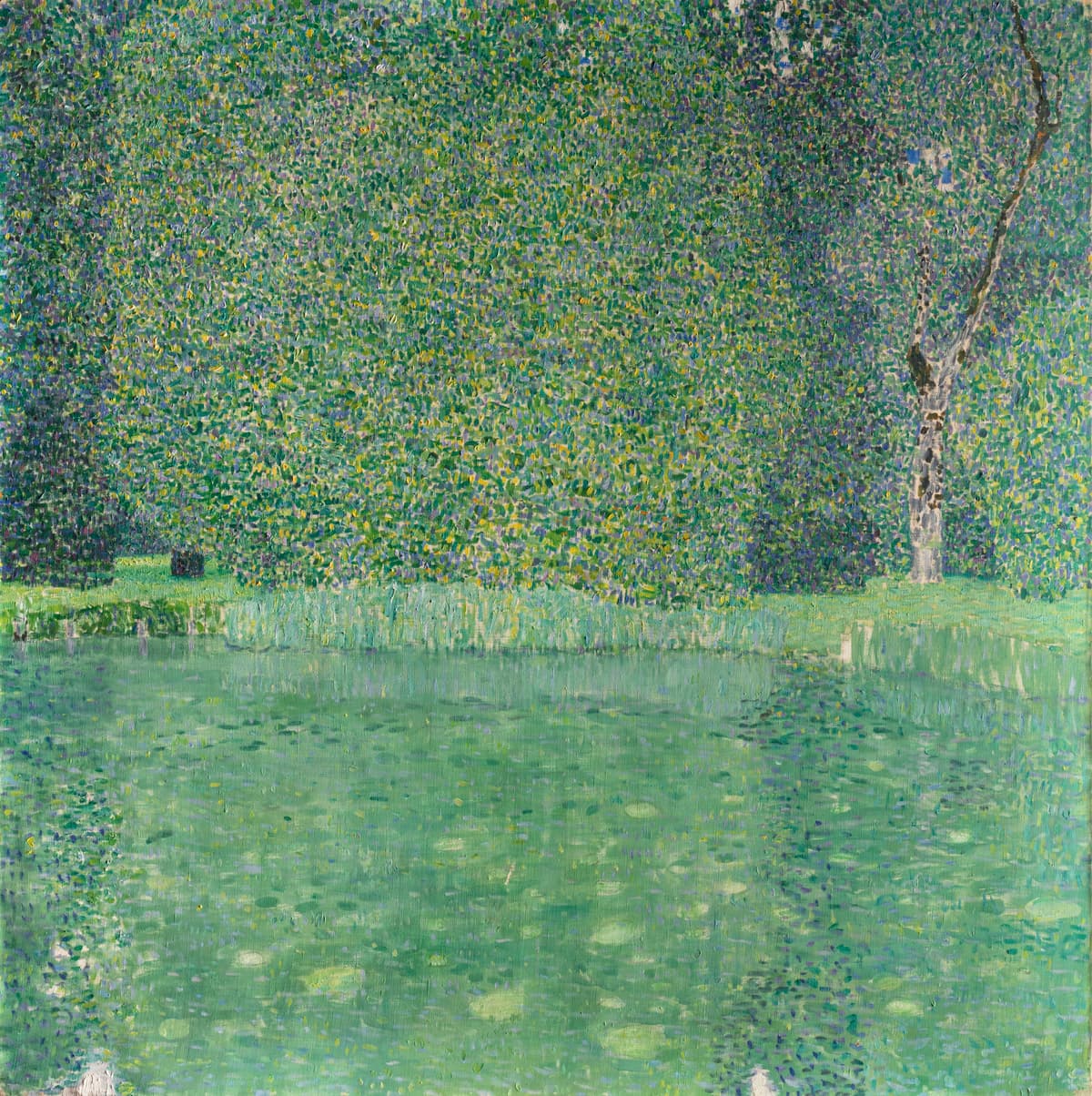 “Park” retains just enough contrast to be legible, and just enough blurriness to deliver the woozy sense of a summer afternoon spent lollygagging. The trees are pointillist — hives of life both macro and micro — but the true triumph is how Klimt paints the water, its surface at some middle point between crystalline and marshy. It too, is green, a serene species of grass. Some of Claude Monet’s most exquisite “Water Lilies” are contemporaries.