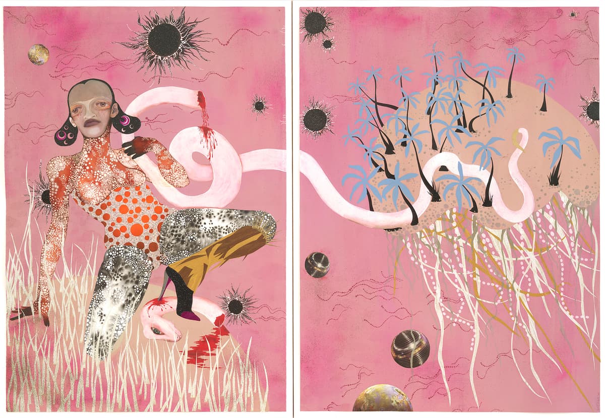 Ms. Mutu is especially deft at collaging, a practice that harnesses her proclivity for juxtaposition, incongruity, and uneasy synthesis. “My Mountain My Mind” looks like a demon at her first Vogue shoot, and “Yo Mama” is an excursion into pink. Ms. Mutu calls it “an imaginary outer space” that features Funmilayo Anikulapo-Kuti, believed to be the first Nigerian woman to drive a car.