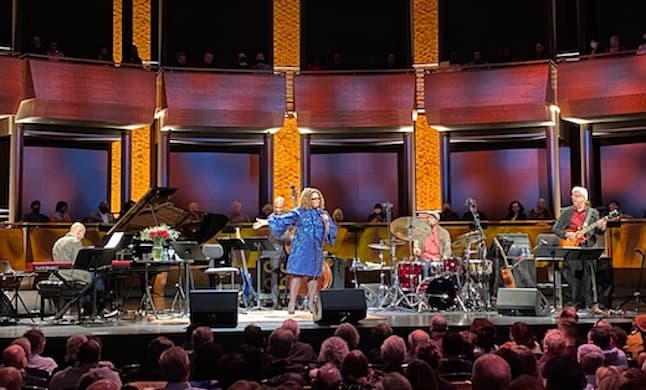 The evening found her crossing many bridges. She began and ended with two classic love songs, “What’s New?” and “That’s All,” the first associated with Sinatra, and the other from the Nat King Cole songbook. More importantly, here are two songs with minimalist titles that deliberately convey as little information as possible, and extremely understated texts.