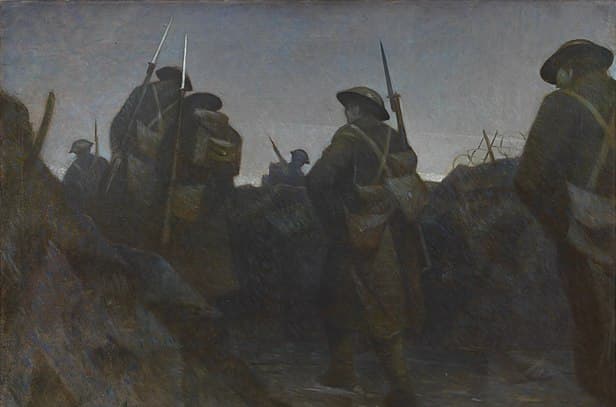 Whether or not it’s true that Kaiser Wilhelm II had issued, in August of 1914, an explicit order “to exterminate the treacherous English,” casualties among the British Expeditionary Forces in the early months of the war quickly mounted toward extermination level. For those English left at home to read the news, the headlines were shattering. Visiting Cornwall in that first terrible year, while he remained untouched by the war’s visceral reality but troubled by its rumors, Binyon wrote “For the Fallen,” his famous elegy for England’s dead.