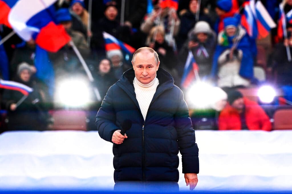 President Putin appeared at a huge flag-waving rally at a Moscow stadium and praised his country’s troops Friday as they pressed their lethal attacks on Ukrainian cities with shelling and missiles.