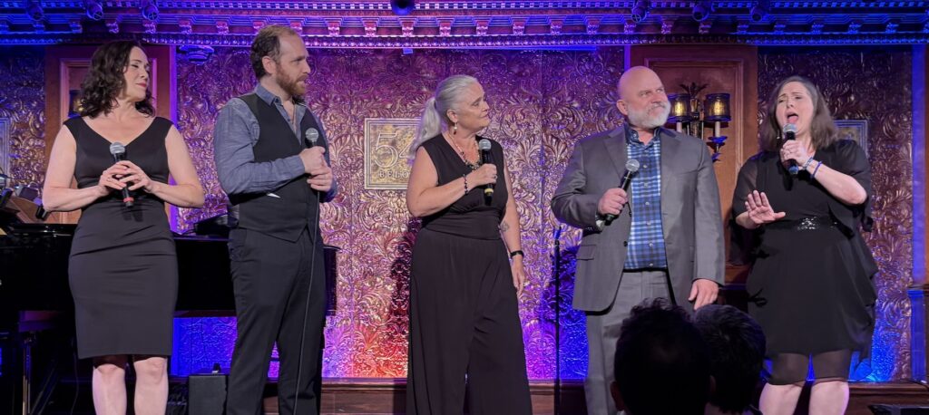 “Merrily” is a textbook definition of the word bittersweet, whereas Sondheim’s “Company” is essentially upbeat but with many profound moments. The transition between the two shows was signaled by a vocal quintet, Marquee Five, consisting of Vanessa Parvin, Mick Bleyer, Julie Reyburn, Adam West Hemming, and Sierra Rein. They performed an exquisitely arranged and sung mashup of “Old Friend” and “Side by Side by Side.”