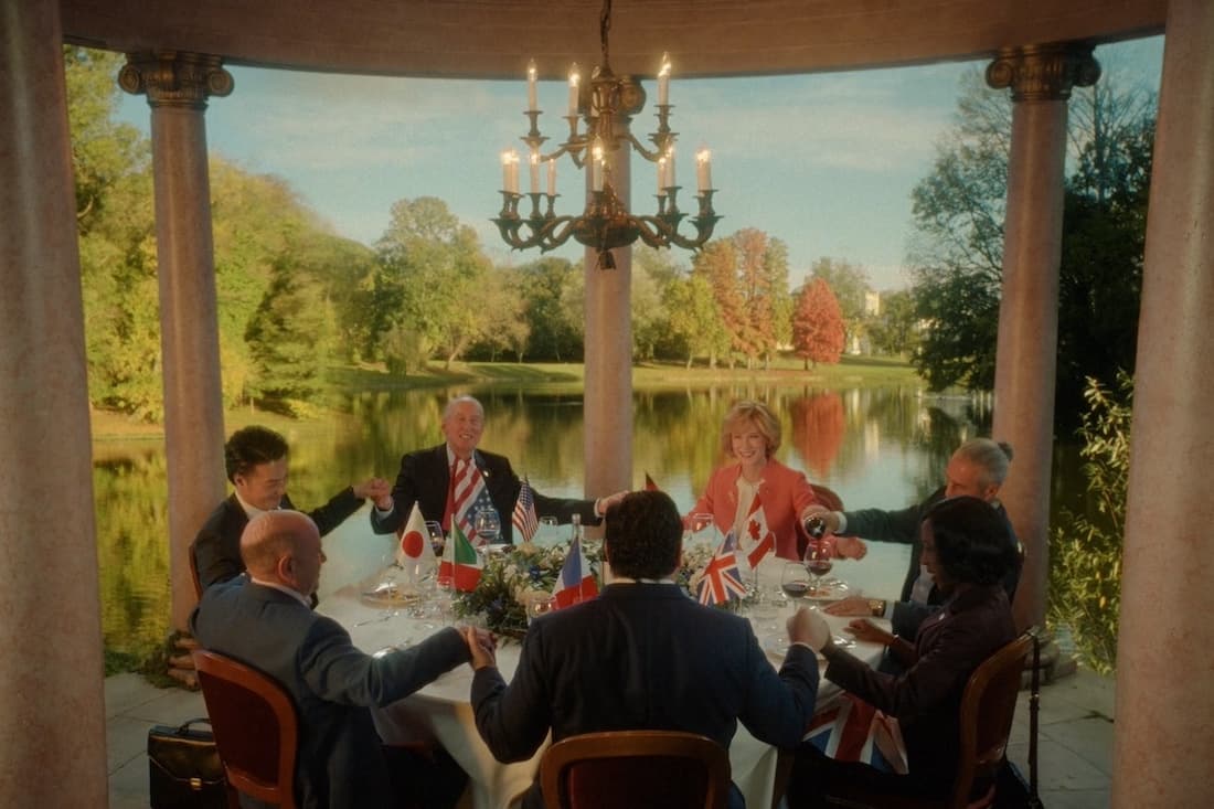 As the statesmen representing France, Japan, and Italy, actors Denis Ménochet, Takehiro Hira, and Rolando Ravello display stereotypical traits and resemble a few recent leaders of their respective countries, though one can’t help but feel the filmmakers missed out on a chance to cast a woman in the Italian premier role to comment on the trailblazing Giorgia Meloni. Beside the German chancellor, the only other woman in the septet is the sensible and competent British prime minister, Cardosa Dewindt, with Ms. Amuka-Bird exhibiting few Liz Truss characteristics.