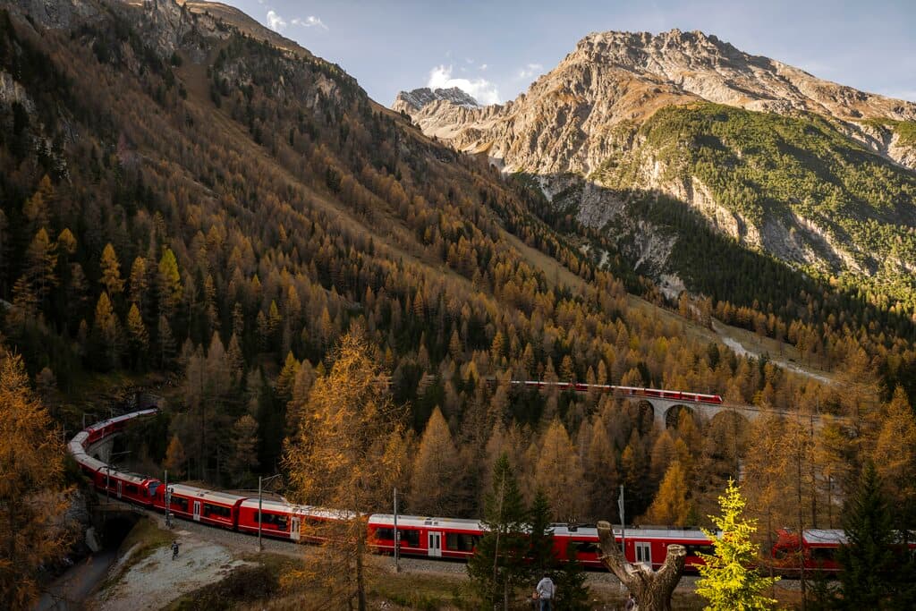The route was designated a UNESCO World Heritage in 2008 and leads through 22 tunnels, some of which spiral through mountains, and across 48 bridges, including the curved Landwasser Viaduct.
