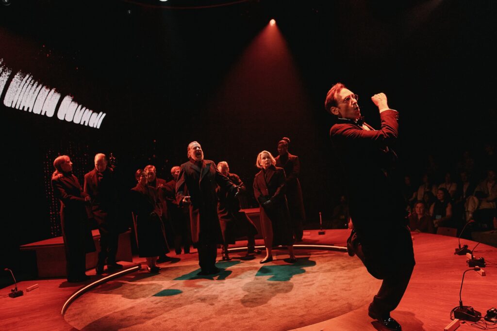 Messrs. Daldry and Martin, currently represented on Broadway by the visually and sonically overwhelming “Stranger Things: The First Shadow” — Mr. Daldry’s many stage and screen credits also include “The Crown,” the popular Netflix series — opt for a less garish but similarly aggressive approach, incorporating vivid video design by Akhila Krishnan and using immersive techniques to ensure audience members feel like participants. Upon entering the theater, everyone is given a delegate’s tag representing one of the nations involved.