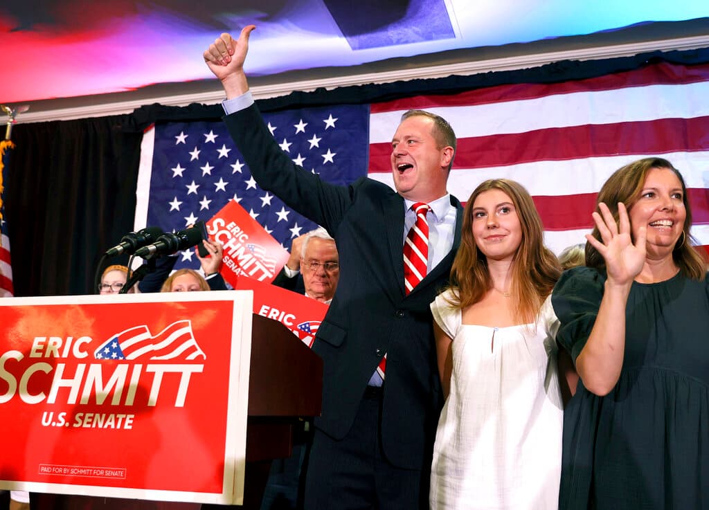 Democratic hopes of picking up a Senate seat in deep-red Missouri faltered Tuesday after Republican voters selected Attorney General Eric Schmitt as their nominee over the former governor, Eric Greitens, who resigned in disgrace in 2018.