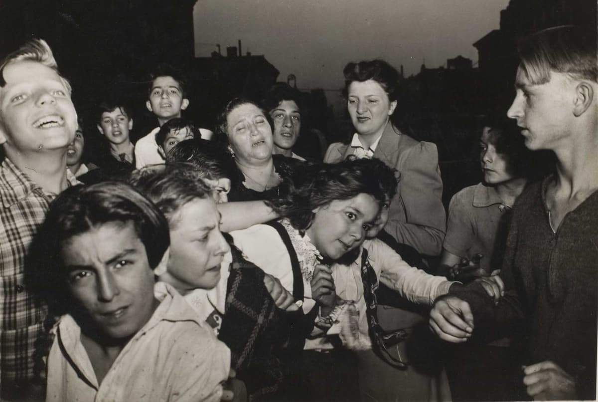Weegee was also one of the first photographers to snap bystanders in the act of witnessing horrific events. He knew that witnesses were as much a part of the story as the main players. Hence one of his most famous photographs, also featured here, of Brooklyn schoolchildren witnessing the murder of a gambler in the street.