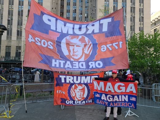 Shortly before Mr. Trump was expected in court at 9:30 a.m., the man who would become the center of the pro-Trump group on Friday, Dion Cini, appeared with a bag and began to unfold pro-Trump merchandise including a sizable flag reading “Trump or Death.”