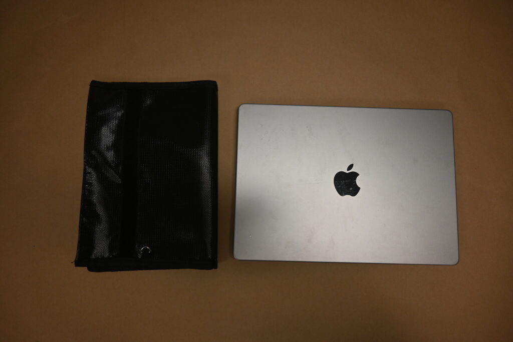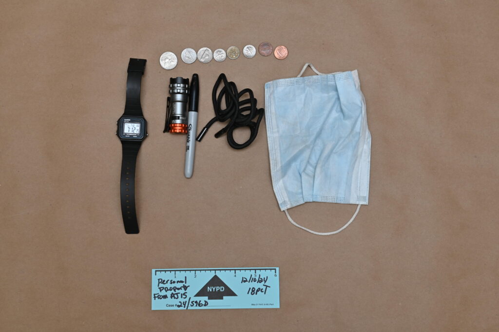 Another photograph of the seized evidence depicts Mr. Mangione’s black leather wallet, which held more cash, in smaller bills; another photograph shows an Apple laptop next to a black purse; and yet a third picture shows a black. 1980’s-style Casio digital watch, a Sharpie, a small flashlight, a piece of string, a medical mask and some coins.