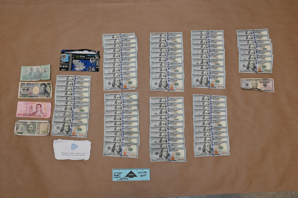Officers laid out the bills on a table at the Altoona police precinct. The cash amounted to $7,750. Mr. Mangione, who’d traveled in Asia, also carried on him four bank notes of foreign currency: twenty Thai baht which equal $ 0.63, one thousand Japanese yen, which equal $6.45, one hundred Thai baht which equal $3.13, and five hundred Indian rupees which equal $5.56.