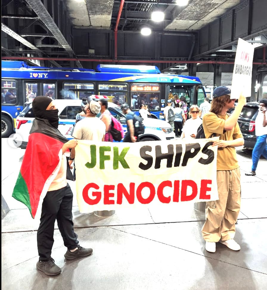 Footage posted on X showed the activists, many shielding their faces with masks and keffiyehs, standing outside the entrance to the AirTrain, which connects nearby subway stations to John F. Kennedy Airport, holding signs and chanting, “JFK, you can’t hide. You’re supporting genocide.”
